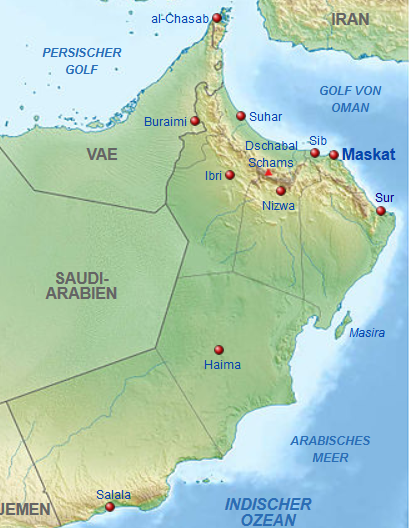 über Weihnachten/Silvester 2013/14 haben wir den Oman bereist. Der Oman grenzt im Nordwesten an die Vereinigten Arabischen Emirate, im Westen an Saudi-Arabien und im Südwesten an Jemen. Zum Staatsgebiet gehören auch die nördlich des Territoriums der Vereinigten Arabischen Emirate an der Straße von Hormus gelegene Halbinsel Rus al-Dschibal am Kap Musandam, die von den Vereinigten Arabischen Emiraten umschlossene Exklave Madha sowie die Gruppe der Kuria-Muria-Inseln und die Insel Masira vor der Ostküste des Landes. Die Küste wird begrenzt durch das Arabische Meer im Süden und Osten und durch den Golf von Oman im Nordosten. Die Staatsgrenzen im Landesinneren sind nicht exakt festgelegt. Der Oman ist etwas kleiner als Deutschland. Hier geht's zu den Bildern...